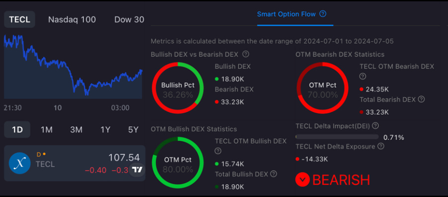 In the past week, from July 3 to July 10, Bitcoin's price dropped to $53,485.93 over two consecutive days, creating market fear and leading the Fear and Greed Index to zero. This was influenced by events such as Mt.Gox’s compensation of 142,000 Bitcoins to past cryptocurrency holders and the German government’s sell-offs. In contrast, TECL showed bearish signs with a net delta exposure of -14.33k from July 1 to July 5, despite a bullish market sentiment indicated by higher call open interest compared to puts.